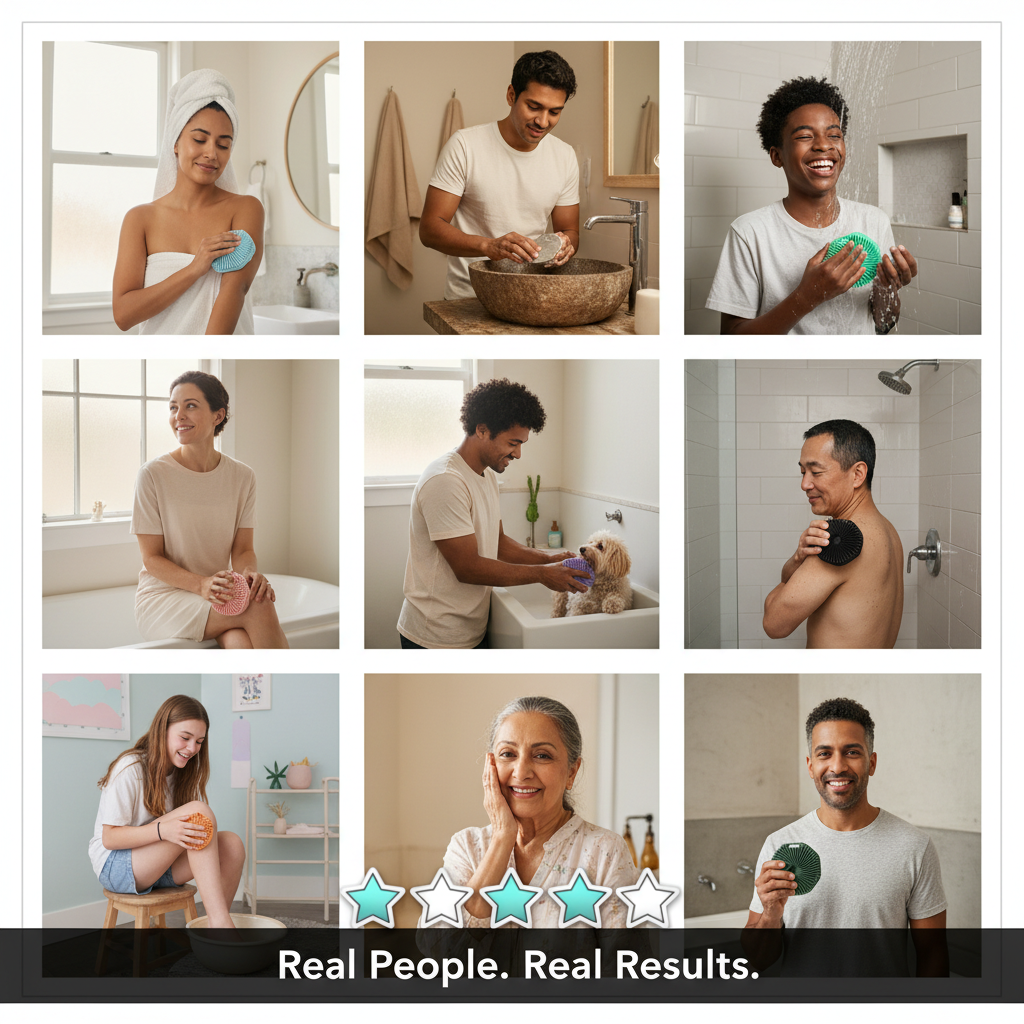 See how Scrubbies™ Sud Bud tackles dirt, sweat, and pet messes with ease. Images showcase its versatile use for body, face, feet, and furry friends.